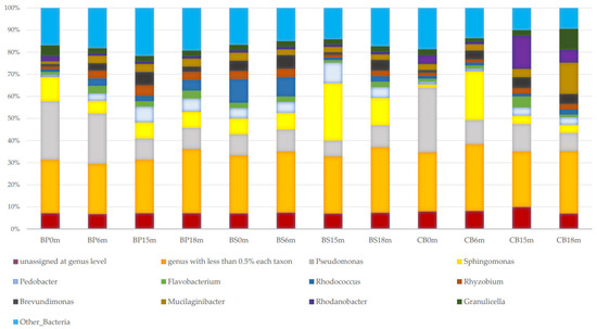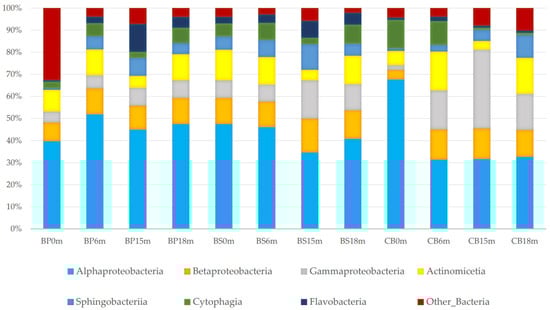 Taxonomic classification of bacterial reads at class level. Names of samples correspond to the species providing leaf litter (BP, Betula pendula; BS, Betula pubescens; CB, Carpinus betulus) and phase of decomposition (0 m, 6 m, 15 m, and 18 m are 0, 6, 15, and 18 months of decomposition, respectively).