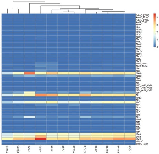 We analyzed a set of metagenomic reads from various incubation times (0 m, 6 m, 15 m, and 18 m) for silver and downy birch and hornbeam (BP, BS, CB) to investigate functional capacity of litter decomposing bacterial communities and variation in nitrogen metabolism capacity of microbial communities. Each dataset includes the total number of forward and reverse reads, mapped reads, predicted average insert size, and predicted average genome size. For instance, the BP-0 m dataset has 12,999,682 forward and reverse reads, with 4257 and 4222 mapped reads, an average insert size of 361, and an average predicted genome size of 12,858,168 (Table S1). These results provide important information regarding the nitrogen metabolism potential of microbial communities across different conditions and locations. Functional groups analysis conducted with the Fama tool indicates specific function categories, such as ammonification, denitrification, nitrate assimilatory and dissimilatory reduction, nitrite assimilation, nitrogen fixation, and urease metabolism. We observed shifts in the numbers of genes responsible for nitrogen fixation at different phases of litter decomposition; the highest number of nitrogen fixation genes was detected in downy birch metagenomes at the first two phases of decomposition. Based on clustering of the heatmap, we see that communities decomposing hornbeam leaves formed individual clades. Only one hornbeam-associated microbial community in the latest phase of decomposition (18 months) was grouped with birch microbial communities (Table S2).