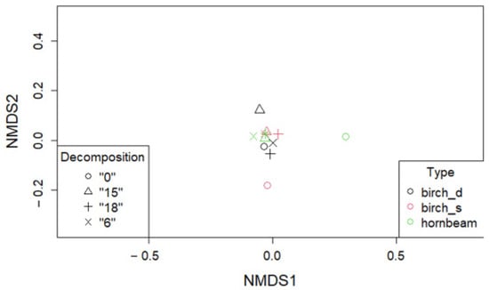 NMDS of the functional gene annotation of microbial communities (birch_s, Betula pendula; birch_d, Betula pubescens; hornbeam, Carpinus betulus). A stress value of 0.05 indicates an excellent fit for the NMDS ordination. The result of ANOSIM (Analysis of Similarities), the R statistic of 0.04, suggests that there is a moderate separation between the groups in your dissimilarity matrix.