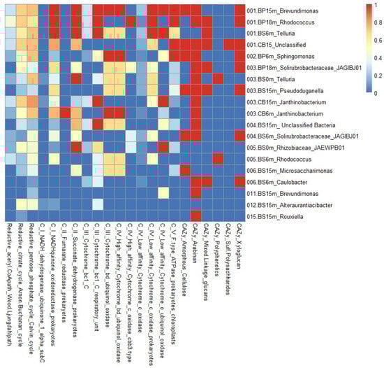 Heatmap of the functional profile of microbial communities. Names of samples correspond to the species providing leaf litter (BP, Betula pendula; BS, Betula pubescens; CB, Carpinus betulus) and phase of decomposition (0 m, 6 m, 15 m, and 18 m are 0, 6, 15, and 18 months of decomposition, respectively).