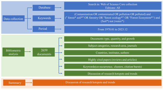 All relevant datasets analyzed in this paper are derived from the Web of Science (WOS) core collection database, including all citation indexes (SCI-EXPANDED, SSCI, AHCI, CPCI-S, CPCI-SSH, BKCI-S, BKCI-SSH, ESCI, CCR-EXPANDED, IC). The WOS database is one of the most authoritative and important databases for obtaining scientific and academic information on a global scale. The retrieval condition was Topic = (contamination OR contaminated OR pollution OR polluted) and Topic = (“forest* soil*” OR forestry OR “forest ecology*” OR “Forest Ecosystem*”) and Topic = soil* not Title = water*. A total of 2659 documents were collected between 1970 and 2023 for analysis using bibliometric tools. These tools enabled the exploration of various aspects, including keywords, authors, institutional affiliations, journals, and citations. This analysis aimed to gain a comprehensive understanding of the topic at hand. Bibliometrics is a valuable quantitative method for analyzing academic literature. We utilized bibliometric tools to visually represent the statistical results, including the Bibliometrix (version 4.1.2) package and CiteSpace (version 6.1.R6). The visualization of data related to institutes, authors, and keywords was presented through figures. In these figures, nodes represent institutes, authors, or keywords, with the size of the nodes corresponding to the number of publications. The connections between nodes are depicted by lines, with the lines’ thickness indicating the connection frequency. Figure 1 illustrates a schematic illustration of this study.