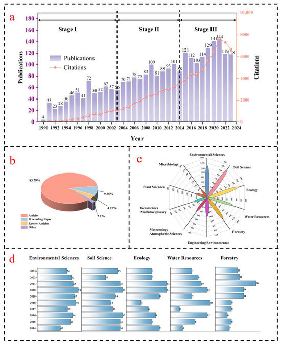 Figure 2b shows the characteristics of different document types with 2391 articles (83.78% of the 2391 documents), 4.27% review articles, 9.85% proceeding papers, and 2.10% other types. To gain insights into the research topic, articles and review papers underwent further analysis using the Web of Science category [31], and the top 15 subject categories are listed in Table S1. The category of Environmental Sciences ranks first, with 1317 articles (49.53% of the total 2659 articles). Soil Science follows with 413 articles (15.53%), followed by Ecology with 244 articles (9.18%), Water Resources with 218 articles (8.20%), Forestry with 216 articles (8.12%), Engineering Environmental with 162 articles (6.09%), Meteorology Atmospheric Sciences with 161 articles (6.05%), Geosciences Multidisciplinary with 126 articles (4.74%), Plant Sciences with 117 articles (4.40%), and Microbiology with 85 articles (3.20%). The cumulative percentage of these subject categories exceeds 100% because journals can be assigned to multiple categories [32]. The field of Environmental Sciences includes various studies that focus on pollutant removal. Figure 2c lists the top 10 categories and Figure 2d further displays the publication trend for the top 5 categories. These categories have gained significant attention in recent years, particularly after 2014. While research on pollutant removal has plateaued in the Environmental Sciences and Soil Science category since 2014, the Forestry category has been gaining popularity since 2019. This indicates that future studies will likely shift their focus from pollutant removal to protecting the entire forest ecosystem, taking into account environmental concerns.