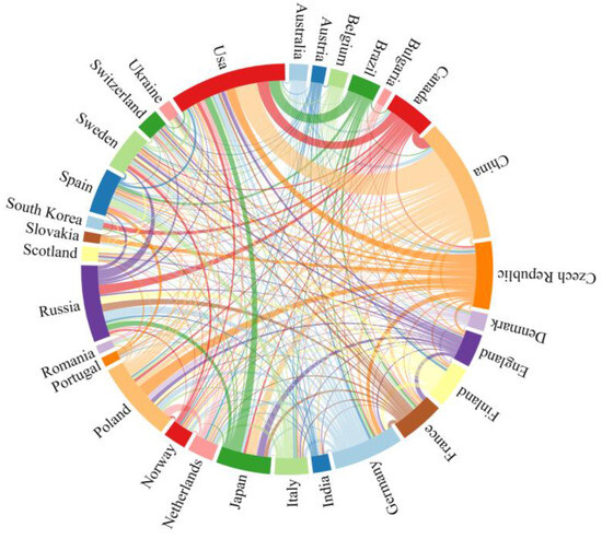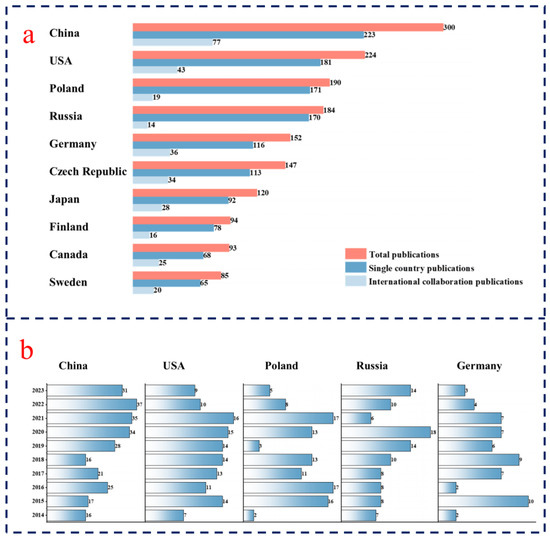 Table 2 presents the top 20 productive countries. Among these countries are 13 from Europe, three from Asia, three from the Americas, and one from Oceania. China leads the list with a total of 300 articles, which represents 11.28% of the total 2659 articles. The USA comes in second place with 224 articles, accounting for 8.42% of the total. Poland follows closely behind with 190 articles (7.15%), followed by Russia with 184 articles (6.92%), and Germany with 152 articles (5.72%). Poland secured third place thanks to the immeasurable contributions of influential authors with many publications. Magiera T (15 papers) mainly focused on the harm and influence of man-made magnetic particles contained in industrial dust and fly ash into forest soil. Niklinska M (12 papers) systematically studied the effects of different soil chemical properties on microbial community structure and diversity in different heavy metal-contaminated soils. Blonska E (11 papers) was dedicated to the impact of organic pollution (such as polycyclic aromatic hydrocarbons) on the physical and biological characteristics of forest soils. The diversity and long-term influence of their research on forest soil make Poland hold the third place. It is important to note that the total percentage may exceed 100% because some papers may be assigned to multiple countries. These numbers indicate the level of activity in the specific field for each country [33]. Forest soil contamination is a topic that is receiving significant attention worldwide, particularly in developing countries. Among the countries studied, the Netherlands ranks first with an average citation score of 76.40 per paper, and Sweden closely follows with a score of 63.10, indicating their high research influence despite fewer publications. The highest cited article is from Sweden, with a citation count of 1301. This article analyzed the phospholipid fatty acid (PLFA) patterns of forest humus soil and cultivated soil contaminated with different concentrations of Cd, Cu, Ni, Pb, and Zn. The results showed that the response of PLFAs to different metal pollution levels was different in the two soil types and the PLFAs pattern variation indicated changes in the microbial community [34], which laid an original methodology for characterizing the microbial community by PLFA analyses. The second-highest-cited article is from the Netherlands, with a total of 1119 citations. This paper reviewed the effects of increased atmospheric nitrogen input from NOy and NHx on the diversity of various semi-natural and natural ecosystems. It highlighted the critical impact of nitrogen deposition and soil acidification, which guided the research direction of the forestry ecosystem [35]. In contrast, China has a relatively low average citation score of 26.40, although it has the most publications. The leading country stands out in both categories due to its impressive publication output. To measure the extent of global collaboration, we calculate the ratio of publications with international cooperation to total publications (ICP ratio) for each country. Figure 3 portrays the cooperative relationships between countries in research, emphasizing notable collaboration, particularly among the top three countries. Figure 4a compares publication numbers for the top 10 countries, while Figure 4b illustrates the publication trend for the top 5 countries. These figures reveal different trends among the countries. China’s publications have gradually increased over the past decade, while the number of publications in the USA has remained stable. Poland and Germany have experienced fluctuating publication numbers, and Russia has exhibited a volatile trend, with its highest publication output recorded in 2020.