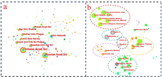 In addition to countries, institutions provide more detailed information regarding research on the topic. This includes well-known institutions in the field and their collaborations. Table 3 displays the top 10 productive institutions from various countries. These include one institute from China, one from Russia, two from France, two from the USA, two from the Czech Republic, one from Sweden, and one from Finland. It is worth noting that there are no institutions in Poland and Germany despite them being among the top 5 most productive countries. The Chinese Academy of Sciences is the leading institution with 255 articles (9.59% of the total 2659 articles), followed by the Russian Academy of Sciences (5.27%), Centre National De La Recherche Scientifique (3.38%), United States Department of Agriculture (3.05%), Indian United States Forest Service (2.37%), Czech University of Life Sciences Prague (2.33%), Czech Academy of Sciences (2.26%), Swedish University of Agricultural Sciences (2.03%), Inrae (1.84%), and the University of Helsinki (1.58%). The total percentage exceeds 100% because some authors are affiliated with multiple institutions. Figure 5a illustrates the cooperative relationship map of the institutions. The size of each circle corresponds to the publication count of a particular institution, while the lines depict the collaborative relationships between the institutions. The color coding indicates the variation over time. Most top institutions have close collaborations, with the University of Helsinki standing out as relatively independent in its research. The larger nodes of several institutions demonstrate active research in the field. Centrality denotes the strength and significance of institutions in the research field [36]. The Centrality value for the Chinese Academy of Sciences is above 0.1, indicating its critical role in the cooperative relationship map [37].
