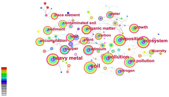 After undergoing pre-treatment and visual analysis, it was determined that the keyword “soil” played a prominent role in this study, acting as a central element and facilitating connections. Following closely behind was the keyword “heavy metal”, which appeared a total of 506 times. Other significant keywords included “pollution” (397 times), “ecosystem” (254 times), “deposition” (250 times), “air pollution” (156 times), “organic matter” (146 times), “accumulation” (140 times), “growth” (117 times), “cadmium” (113 times), “copper” (104 times), and “sediment” (98 times). These keywords have all emerged as crucial components in the network due to their high frequency of occurrence.