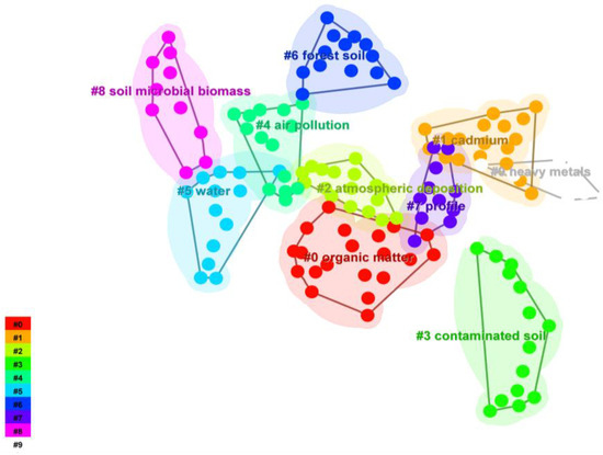For cluster#9 of “heavy metals”, the top five keywords included “heavy metal” (78.21%), “spatial distribution” (6.65%), “agricultural soil” (6.03%), “acid deposition” (2.47%), and “chemistry” (1.85%). Cluster 9 mainly discussed the effects of heavy metals and their spatial distribution on forest soil and ecosystems. Heavy metal pollution in forest ecosystems is becoming more and more serious. There is an urgent need to understand better the ecotoxicological effects of heavy metals on the entire forest ecosystem [91]. Yan et al. explored the spatial distribution pattern of heavy metals in soil in southeastern China, the spatial correlation of heavy metal pollution in soil and bamboo shoots, and the risk assessment of heavy metals in soil [92].