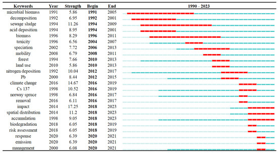 The term “with bursts” refers to a keyword with a high frequency of citations, indicating that it is receiving significant attention from researchers during a specific period. Therefore, the analysis of keyword bursts can effectively identify the research frontier and future trends [93]. Using CiteSpace analysis, we selected the top 25 keywords with the most robust citation bursts from 1990 to 2023 after excluding similar and unrelated keywords (Figure 8). The results show that the research topics have varied over time. In the early 1990s, “microbial biomass” and “decomposition” were the most studied and enduring topics. They had a prolonged period of burst intensity, with values of 5.86 and 6.95, respectively. These keywords suggest that most studies focused on the microbial decomposition of pollutants in forest soils. Subsequently, the pollution of forest soil caused by atmospheric deposition became a widespread concern, particularly “acid deposition” and “nitrogen deposition”. From 2012 to 2018, “Pb”, “Cs 137”, “removal”, and “impact” emerged as common keywords, indicating that researchers were focusing on the pollution and removal of heavy metals in soil and the impact of the Chernobyl events on forest soils. Since 2018, “risk assessment”, “response”, “emission”, and “management” have become prominent keywords, with intensities of 6.05, 6.39, 6.39, and 6.08, respectively. This suggests that researchers have started to pay more attention to investigating and assessing the risks associated with forest ecosystems.