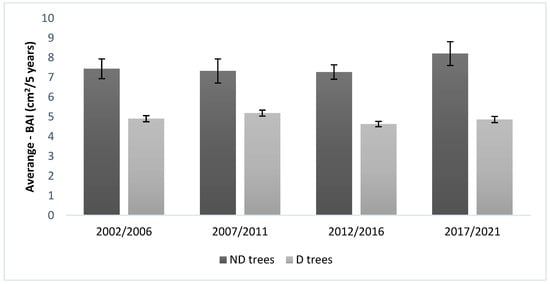 Average of basal area increment (BAI) in (n = 12) dieback (D) and (n = 12) non-dieback (ND) trees over five-year periods (overbars indicate the standard error).