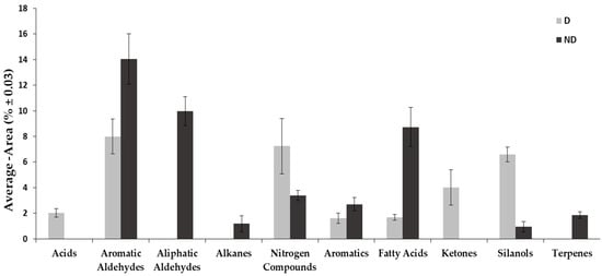 As shown in Figure 2 (Table 3), over the years, a notable reduction in aliphatic and aromatic aldehydes, alkanes, aromatic compounds, terpenes, and fatty acids was observed in D plants compared to ND plants, while the same plants showed an increase in acids, nitrogen compounds, ketones, and silanols.