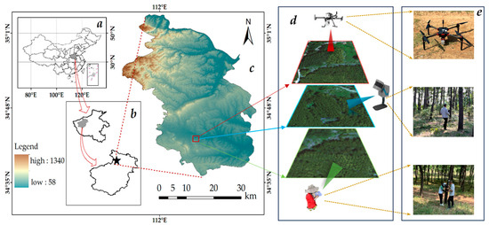 (a) Henan Province of China, (b) Luoyang City, (c) Topographic map of Xin’an County, (d) Top-down view of the data collection area, (e) UAV-LiDAR, LiDAR-SLAM and ground-based measurements.