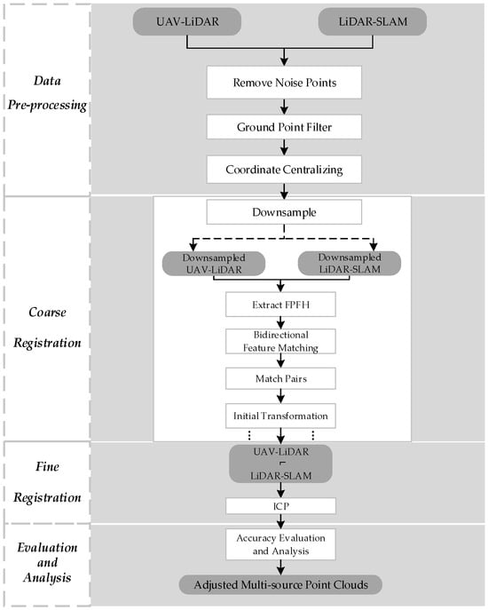 Figure 2 shows the automatic, unmarked coarse-to-fine registration process of point cloud data from two platforms. The process primarily consists of four steps: (1) data pre-processing, including removal of noise points (e.g., isolated and outlier points), coordinate centralizing, and ground point filtering; (2) coarse registration, where downsampling is performed on SLAM and UAV-LiDAR by using the voxel grid algorithm, the Pearson correlation coefficients of the point pairs are computed by using the FPFH feature descriptor and the bidirectional feature matching algorithm, and then the RANSAC algorithm is applied to compute the initial transformation matrix; (3) fine registration, where the point cloud is divided into a series of subspaces by using the KD-tree algorithm to accelerate nearest neighbor search in the ICP process [46,47], with the target of refining the transformation matrix; (4) accuracy assessment and analysis to quantify the transformation errors between the aligned SLAM and UAV-LiDAR datasets. Overall, compared to the limitation that the traditional RANSAC algorithm requires to traverse all the points to fit the transformation matrix, our proposed method obtains a set of randomly sampled initial point sets with a small range and higher accuracy by using bidirectional feature matching algorithm according to these point sets to compute the transformation matrix, which can significantly improve the efficiency and accuracy of registration.