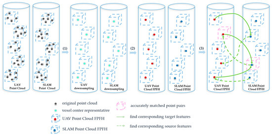 (1) represents that the original point cloud is downsampled through the voxel grid to preserve the voxel center point. (2) represents the extraction of voxel centroid FPFH features. (3) represents bidirectional matching of the FPFH features for the voxel center points between the reference point cloud and target point cloud.