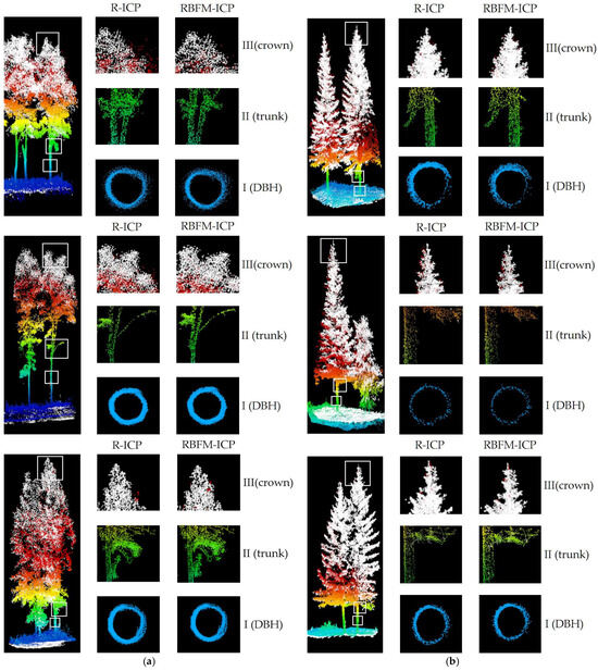 Visual evaluation of two coarse-to-fine alignment algorithms (i.e., R-ICP and RBFM-ICP). (a) Broadleaf forest sample plots. (b) Coniferous forest sample plots. White dots represent UAV data, and elevation-rendered dots represent SLAM data. Slices I, II and III represent the 1.3 m above ground level diameter at breast height (DBH) fitting, trunk and crown sections, respectively.