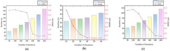 Furthermore, this study used the R-ICP algorithm in different types of forest stand scenarios, which required an average of 1000 iterations to achieve convergence in the registration results (average runtime: 141.575 s). However, the improved registration algorithm by bidirectional feature matching compressed the average number of iterations to 340, which significantly improved the registration efficiency. Figure 6 shows the execution efficiency and transformation error of the RBFM-ICP algorithm for various scenarios with different numbers of iterations.