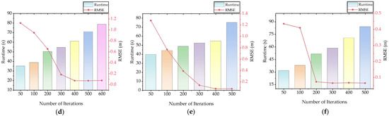Execution efficiency and transformation error of the RBFM-ICP algorithm for various scenarios with different numbers of iterations. (a–c) Three sample datasets of broadleaf forest; (d–f) Three sample datasets of coniferous forest.