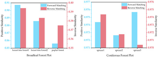 From Figure 7, the average similarity of both forward and reverse matching processes for coniferous forests was significantly higher than that for broadleaf forests. It was worth noting that for the three datasets of broadleaf forests, the forward similarity was mainly distributed between 0.85 and 0.91, while the reverse similarity was mainly distributed between 0.37 and 0.40, with a large difference in forward and reverse similarity. In contrast, the forward and reverse similarity of the three datasets for coniferous forests showed a high degree of consistency, clustered between 0.97 and 0.98. This indicated that for different stand types, coniferous forests have a greater probability of identifying the best feature match than broadleaf forests.
