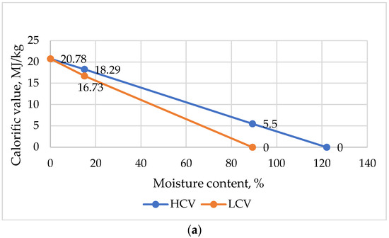 The influence of moisture content on the calorific value of pellets: (a)—for pellets from sunflower seed shells; (b)—for beech sawdust pellets; HCV—high calorific value; LCV—low calorific value.