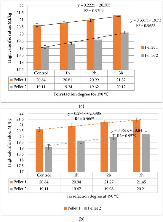 A slight increase in the calorific value was observed (Figure 18), but it was much smaller than that of the mass loss. If we take into account the entire range of variation in Figure 18, it is found that, with an increase in mass loss by 1%, an increase in the calorific value of only 253 kJ/kg will be obtained in the case of pellets from the shells of sunflower seeds and of 128 kJ/kg in the case of beech sawdust pellets (over the entire temperature range). Therefore, the pellets obtained from the shells of sunflower seeds have a better degree of torrefaction than that of pellets obtained from beech sawdust.