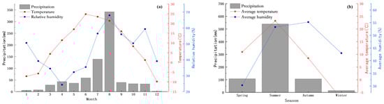 Variation characteristics of precipitation, temperature, and relative humidity at the (a) monthly scale and (b) seasonal scale in the study area.