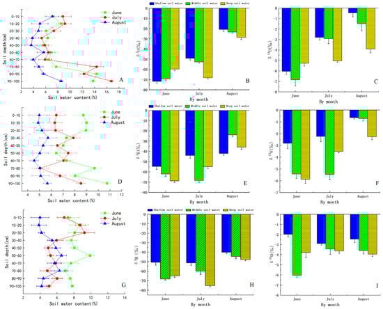 Characteristics of soil moisture content and δ2H and δ18O values in soil water in different soil layers. ((A–C): Represents the Pinus sylvestris var. mongolica site; (D–F): Represents the Caragana korshinskii site; (G–I): Represents the Medicago sativa site).