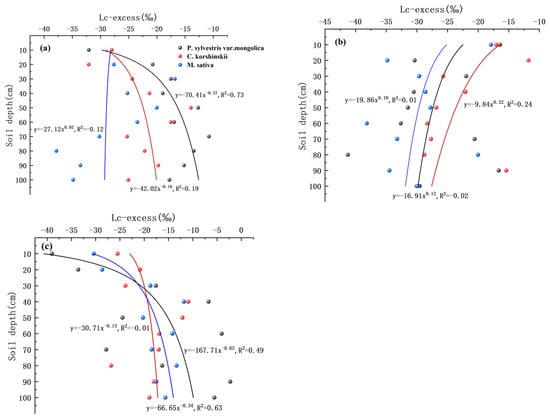 Vertical distribution characteristics of LC-excess value of soil water. ((a–c): Represents the chronological months from June to August).