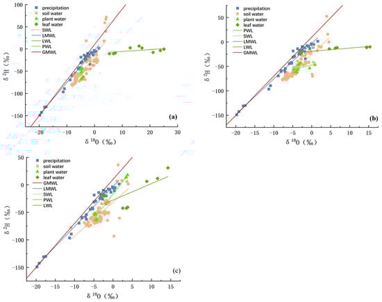 Relationship between δ2H and δ18O in precipitation, soil water, stem water, and leaf water in the study area from June to August: (a) Pinus sylvestris site, (b) Caragana korshinskii site, and (c) Medicago Sativa site; GMWL: global meteoric water line; LMWL: local meteoric water line; SWL: soil water line; PWL: plant water line; LWL: leaf water line.