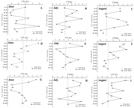 Changes of δ18O in stem water and soil water of Pinus sylvestris var. mongolica, Caragana korshinskii, and Medicago sativa stem. (A–C): Represents P. sylvestris var. mongolica; (D–F): Represents C. korshinskii; (G–I): Represents M. sativa).