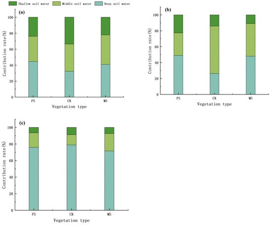 Utilization ratio of potential water sources by Pinus sylvestris var. mongolica, Caragana korshinskii, and Medicago sativa. (PS: Pinus sylvestris; CK: Caragana korshinskii; MS: Medicago sativa) ((a–c): Represents the chronological months from June to August).