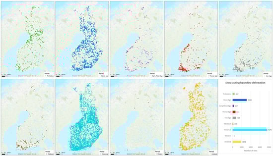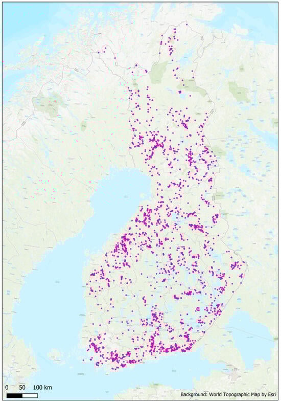 To form a comprehensive understanding of which archaeological sites may be endangered by forestry activities, observations were specifically extracted from the register for those archaeological sites that lack boundary delineation. From the new table formed from the Register of Ancient Sites, which includes information on all sites lacking a boundary delineation in the register, the following data were extracted: the register contains 37,309 legally protected archaeological sites (Kiinteä muinaisjäännös), and of these, a total of 14,082 sites, or 37.74%, were without a boundary delineation (polygon in the register). This aligns with the Finnish Heritage Agency’s report from 2022, which indicated that approximately 42% of sites in the register lacked boundary delineation at that time []. In this instance, it was decided to exclude other cultural heritage sites, potential archaeological sites, find spots (which are usually point-like anyway), natural formations, and other sites from the statistics, as the absence of an area form is not as critical for these as it is for legally protected archaeological sites. The archaeological sites lacking boundary delineation are geographically distributed fairly evenly across Finland; however, differences can be observed between the locations of sites from different periods (Figure 1).