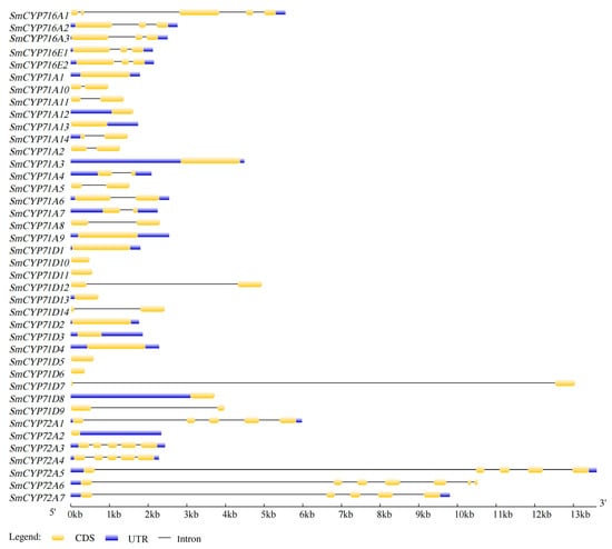 Exon and intron structures of SmCYP450 genes. The CDS is the coding region of the protein; the UTR is the untranslated region, a non-coding fragment at each end of the mRNA molecule; the intron, also known as spacer order, refers to a fragment of a gene or mRNA molecule that has no coding role.