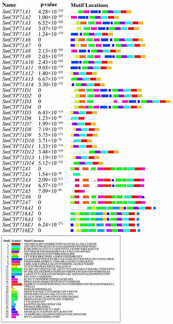 Sequence comparisons were performed using MEME, and the top 30 motifs were selected (Figure 3). The 40 SmCYP450 proteins contained 1–14 motifs; all contained motif 1 except CYP72A2, probably because its short sequence was not displayed correctly. All of the proteins in the CYP72 family, excluding seven, contained motif 21. The three members of the CYP716A subfamily had identical conserved motifs, and almost identical amino acid sequences. The two members of the CYP716E subfamily had identical conserved motifs, suggesting that they have similar or identical functions.