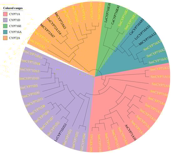 Based on the phylogenetic tree (Figure 5), the SmCYP450 proteins belonged to three families (CYP71, CYP72, and CYP716). Of the SmCYP450 proteins, 28 were categorized into the CYP71 family, among which 14 clustered into the CYP71A and CYP71D subfamilies, 7 into the CYP72A subfamily, 5 into the CYP716 subfamily, 3 into the CYP716A subfamily, and 2 genes into the CYP716E subfamily. The phylogenetic relationships of different species in the same family suggest that these genes have similar functions, enabling functional analysis and identification. However, clustering in a phylogenetic tree can only characterize the evolutionary correlations of related genes and does not provide information on their functions. The functions of the 40 SmCYP450 genes need to be determined by heterologous expression in Saccharomyces cerevisiae and transient expression in tobacco.