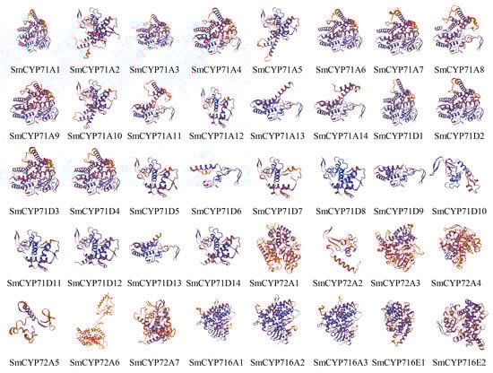 Sequences 2000 bp upstream of the coding region were selected, and the cis-acting elements of SmCYP450 genes were predicted using PlantCARE (https://bioinformatics.psb.ugent.be/webtools/plantcare/html/, accessed on 16 February 2024) []. The secondary and tertiary structures of SmCYP450 proteins were investigated using the GORIV secondary structure prediction method and Swiss Model (https://swissmodel.expasy.org/, accessed on 17 February 2024) [], respectively.