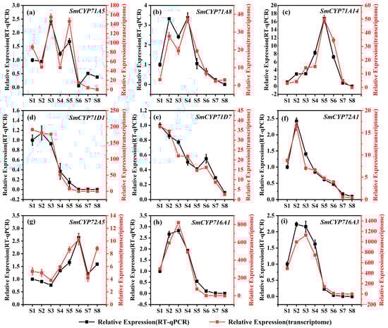 Relative expression levels of SmCYP450 genes at eight stages of fruit development. Left, relative expression by RT-qPCR. The left black axis corresponds to the black broken line. Right, expression by transcriptome sequencing. The right red axis corresponds to the red broken line. S1 to S8 are the eight stages of fruit development; the exact dates of the division are explained in detail in Section 2.1. (a) SmCYP71A5; (b) SmCYP71A8; (c) SmCYP71A14; (d) SmCYP71D1; (e) SmCYP71D7; (f) SmCYP72A1; (g) SmCYP72A5; (h) SmCYP716A1; (i) SmCYP716A3.