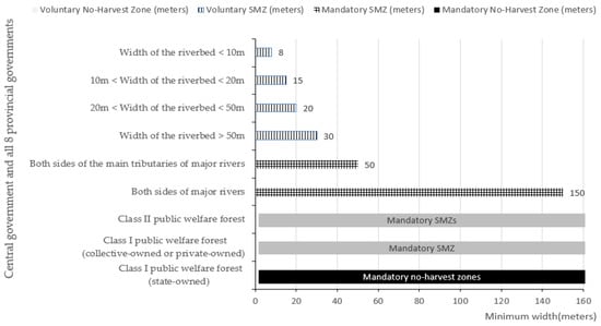 Based on the analysis above, we found that the central government requires the rule of a mandatory SMZ (special management zone) to be followed for those important rivers and their main tributaries, and a voluntary SMZ for the others. Moreover, if the riparian forests are demarcated to class I national public welfare forests and are state-owned, then these forests are mandatory no-harvesting zones. The remaining collective-owned, private-owned class I national public welfare forest and class II public welfare forests are regulated by mandatory SMZs (see