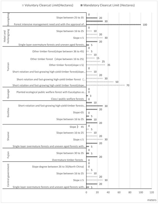 Clearcutting is one of the most controversial issues in forest management. In the past, clearcutting was the most popular measure and easiest way to cut down trees, which can harvest timber with the lowest cost. However, many foresters have questioned whether clearcutting can cause habitat loss and fragmentation. Here, we took the maximum clearcutting limits as an indicator to compare the clearcutting regulations in different countries and divisions.