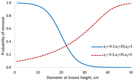 where is the thinning intensity (proportion of removed trees, or probability of removal) for diameter , and , , and are parameters optimized separately for each thinning treatment.