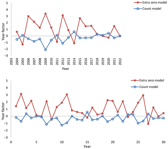 The mean and standard deviation of the residuals of this model were 0.00001 and 0.8514, respectively. The scenarios of the year factors of the extra zero model were produced by calculating a prediction from Equation (6), using the stochastic year factor of the count model as the predictor. Then, a normally distributed random number corresponding to the residual of Equation (6) was added to the prediction. Figure 3 (bottom) shows that this method produces temporal series that have the same features as the modeled year factors.