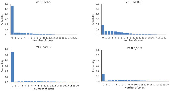In deterministic simulation, all trees with the same diameter had the same number of cones in a certain year and stand (Equation (2)). In the stochastic simulation, the distribution of the cone count was calculated for every tree (see [7] for details). The number of cones was drawn randomly from the probability distribution [7]. Figure 5 shows four examples of the distribution for the same tree with four different combinations of the year factors of the count and extra zero models.