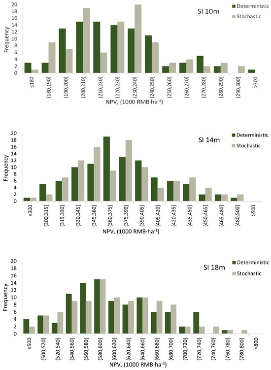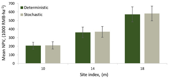 When the stochastic growth scenarios were stationary, the distributions of the NPVs calculated for the optimal management schedule indicate slight superiority of the stochastic optima; under the same set of growth and cone yield scenarios, the stochastic optima produced fewer poor outcomes (low NPVs) and a higher number of good outcomes (Figure 6). However, the superiority of the stochastic optima in the mean NPV of the 100 outcomes (Figure 7) was small, 0.4% in site index 10 m, and 0.9% in site indices 14 and 18 m.