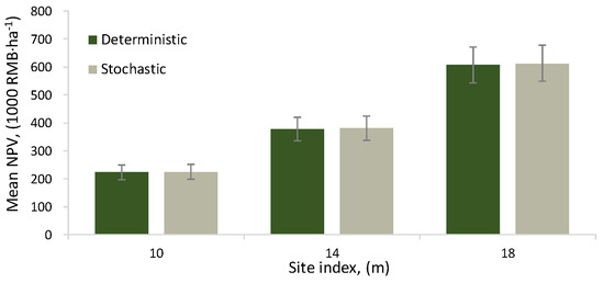The mean net present value when the management schedule based on deterministic or stochastic optimization was simulated stochastically under 100 different scenarios for tree growth and cone yield. The vertical line shows the standard deviation of the net present value.