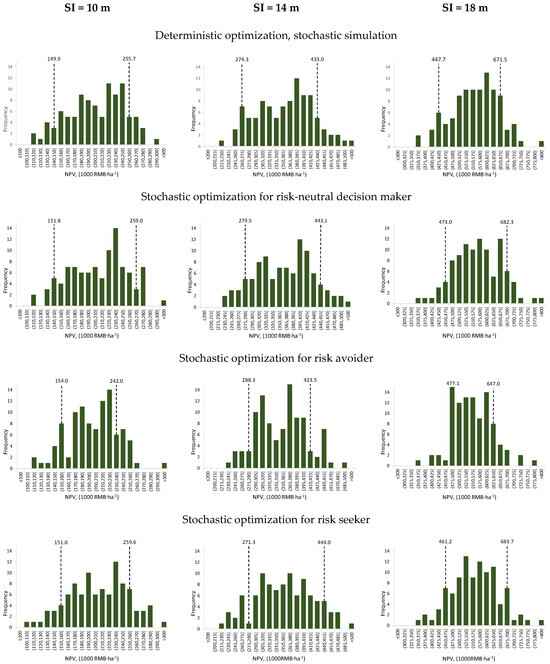 Stochastic optimization may maximize the mean value of the distribution of net present values (or any other objective variable), obtained from repeated stochastic simulations (the expected value). Maximizing the expected value corresponds to risk neutrality [11,12]. If there is a production or harvest volume target, stochastic optimization allows one to maximize the probability that the target is reached [13].