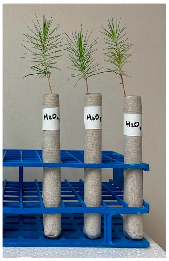 One hundred days post-planting, seedlings (N = 4) of comparable size and morphology were removed from potting medium and rinsed for 30 s in dd H2O to remove soil and expose as much root tissue as possible for the uptake of dsRNA. Seedlings were then transferred to 19 mL autoclaved cylindrical glass assay containers (1.6 cm × 15 cm) (Fisherbrand, Carlsbad, CA, USA) containing 15 mL of sterilized H2O [36]. Seedlings were randomly assigned to dsSHI (n = 2), which received 150 μg of dsSHI mixed into the water (10 μg/mL), while control seedlings (n = 2) received only water. Assay containers were sealed around the seedling stem with parafilm (Bemis Company, Inc, Neenah, WI, USA) to prevent evaporation, and the outer surface was wrapped in opaque brown paper to prevent light penetration to the water solution (Figure 1). Experimental seedlings were returned to the greenhouse following treatment and maintained under ambient conditions.