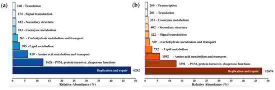 Functional classification of predicted peptide sequences from differentially expressed (a) upregulated and (b) downregulated transcripts. Top Clusters of Ortholog Groups (COG) categories with each representing >1% of the total classified peptides. COG classification obtained from eggNOG-mapper v2.