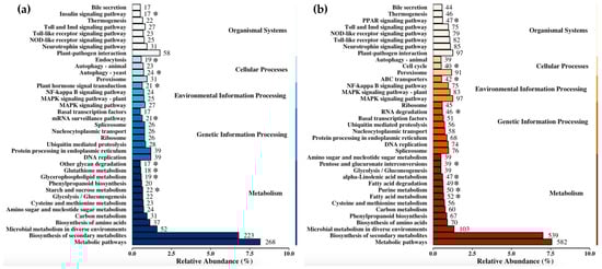 KEGG pathway enrichment for predicted peptide sequences from differentially expressed (a) upregulated and (b) downregulated transcripts (eggNOG-mapper v2). Pathways that mapped to less than 0.5% of annotated transcripts were excluded. Asterisks denote pathways unique to each list.