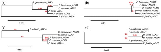 Similar to the DICER-LIKE proteins, ARGONAUTE proteins generally adhered to the broad phylogenetic patterns of pines, although between proteins there was diversity in clade formation. Analysis of ARGONAUTE 1 (AGO1) revealed a near reconstruction of the pattern observed in the reference phylogeny, with strong support for subsection Contortae and Australes, with P. ponderosae most dissimilar to the other Trifoliae and P. flexilis the most dissimilar from the Pinus subgenus (Figure 5). While AGO1 demonstrated high levels of support for the clades established in the work by Jin et al. (2021), other ARGONAUTE proteins did not retain this similarity. P. flexilis again was placed as the most divergent protein for ARGONAUTE 2 (AGO2) and ARGONAUTE 7 (AGO7). However, despite being classified in a different subgenus, for ARGONAUTE 4 (AGO4), P. flexilis showed more relatedness to the Contortae and Australes pines, with P. elliottii and P. ponderosae forming a unique clade in this phylogenic reconstruction. AGO2, similarly to DCL4, was represented by a single complete coding region, except for in P. elliottii and P. taeda, both of which contained two isoforms for AGO2. AGO7 had the lowest overall bootstrapping support, but this was likely due to the near-identical nature of the protein sequences.