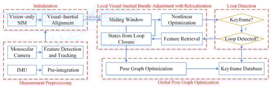 As shown in Figure 1, the implementation of monocular SLAM typically consists of modules, i.e., data preprocessing, initialization, non-linear optimization based on a sliding window, loop closure detection, and pose graph optimization [46]. In the data preprocessing stage, images undergo Harris corner extraction and pyramid optical flow tracking. However, the outliers are removed using the RANSAC algorithm, and the tracked feature points are added to the image queue for backend processing. Concurrently, IMU data are processed through an integration providing pose information such as position, velocity, and rotation. The pre-integration increment, its Jacobian matrix, and covariance are calculated, providing the necessary data for subsequent optimization. During the initialization stage, the system performs a pure visual estimation using SFM (Structure from Motion) technology, estimating the pose of all frames within the sliding window and the inverse depth of 3D landmark points. The SFM is loosely coupled with IMU pre-integration, working to align and solve the initialization parameters. However, in the non-linear optimization stage based on the sliding window, the system integrates visual IMU and loop closure constraints into a significant objective function for non-linear optimization, solving for the pose and bias of all frames within the sliding window. Loop closure detection is conducted by using the DBow (Distributed Bag of Words) algorithm. Once a loop is successfully detected, the system relocalizes and optimizes the camera trajectory to enhance the accuracy of the trajectory estimation. Finally, pose graph optimization ensures the global optimization of historical poses based on the relocalization results, further strengthening the system’s stability and accuracy.