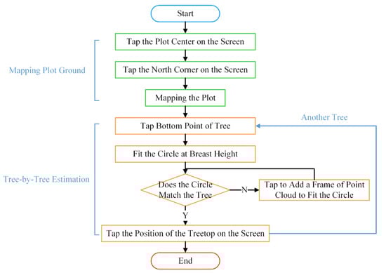 An Android application for forest plot surveys was developed to enable SLAM mobile phones to be used for forest inventory. The application uses augmented reality technology, combining an array camera as the observation sensor and an IMU as the motion sensor. In this, the array camera exhibits more minor errors in long-duration and long-distance pose estimation. At the same time, the IMU shows a higher accuracy in short-duration and short-distance pose estimation, maintaining reliability even in rapidly changing conditions [40]. The fusion of these two types of sensor data adequately compensates for their shortcomings and will be a mainstream method in SLAM systems. Based on this system, plotting a plot map and the individual tree estimation are achieved (Figure 2). The system initially needs to construct a plot map by establishing a coordinate system at the center of the plot, drawing plot boundaries, and adjusting and standardizing global coordinates. Subsequently, each tree’s position, DBH, and height are estimated and recorded according to the algorithm designed.