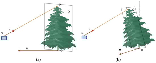 Here, is a parameter so that the ray will strike a plane parallel to the y-axis and face the device, with the normal vector of the plane passing through the tree base point as . Since plane faces the device, can be represented as in Equation (14):
