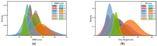 Probability density functions for DBH and tree height for different plots. (a) DBH; (b) tree height.